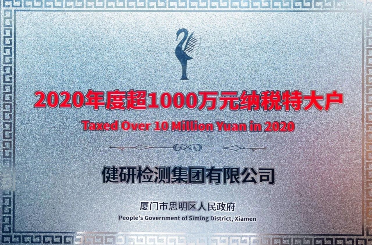 克日,,,,,,,,中共思明区委、思明区人民政府对2020年纳税先进企业举行表扬。。。。。。918博天娱乐集团、厦门建研购商业有限公司获“2020年度纳税大户”称呼。。。。。。健研检测集团获“2020年度超1000万元纳税特大户”称呼,,,,,,,,此为健研检测集团一连13年获此称呼。。。。。。918博天娱乐集团提倡“爱员工、爱公司、爱社会”,,,,,,,,是社会财产的孝顺者。。。。。。