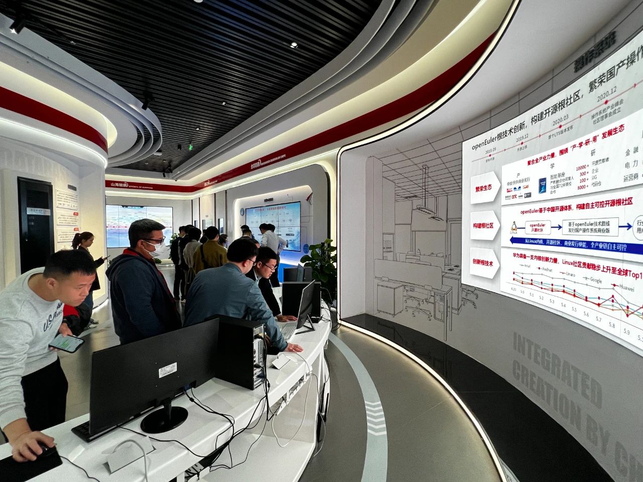 四川鲲鹏&欧拉生态立异中心展厅由新片展区、主板服务器展示区、PC展示区及生态鲲鹏等组成,,,,,,,,集中展示了基于鲲鹏生态最新手艺与应用场景。。。。。。。。